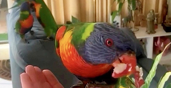 Georgina Brough and Christian Allen get daily visits from a group of wild lorikeets—birds that broke in a year ago and now want to hang out constantly.