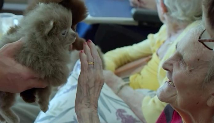 This is the heart-warming reaction of care home residents as they enjoyed a visit from an adorable group of Pomeranian and British bulldogs.