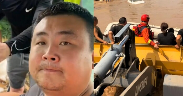 At times he carried firefighters and other rescue personnel out to affected areas in the scoop, before bringing people back the other way. South China Morning Post also reports that he used the bulldozer like a dam to allow rescuers to access flooded areas.