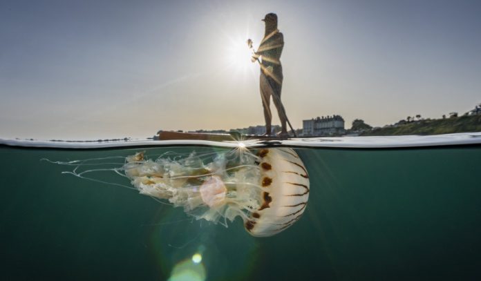 The image was taken by photographer and film-maker Lewis Jefferies off Falmouth in Cornwall It features Lewis’s partner, Sammy, paddleboarding above a compass jellyfish with the sunshine beaming from behind her.