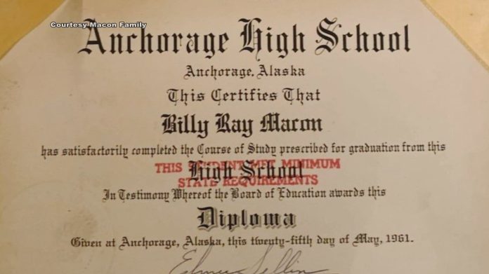 Though Macon graduated from West Anchorage High School in 1961, his diploma was given to him with a red stamp displaying a rude reminder that “this student met minimum state requirements,” and turning the diploma from a point of pride, into a point of pain.