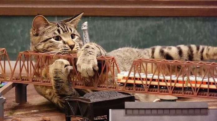 The cats began making themselves at home amidst the restaurant’s perfectly scaled model train dioramas. Though diminutive in real life, the kitties towered over the miniature landscapes looking very much like something out of a movie that might easily be titled, “Attack of the 50-Foot Felines!”