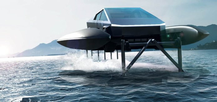 The Cybercat idea is designed to quickly transform Tesla’s vehicle into an all-electric high performance amphibious catamaran.