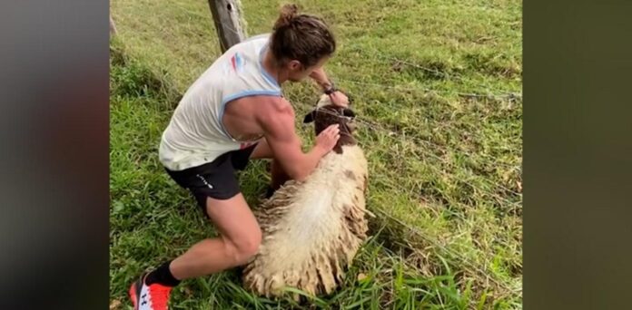 In the viral video—which now has more than 16 million hits on Twitter—Nick switches on the emergency lights of his car, then jumps out and runs to help a black and white sheep entangled in a barbed-wire fence.