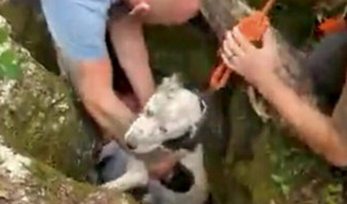 The dramatic footage shows the heroic rescue and reunion of ‘Dewey’ the dog trapped at the bottom of a 30-foot-deep cave—for over two weeks.