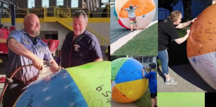 Katherine Marshall Kartman wrote on Instagram: “The Stoughton Community Beach Ball greeted us first thing this morning by rolling up onto our driveway 😄🙃😜. Thanks to the Davie family for helping it get a good nights sleep…We all signed it and then sent it on its merry way, traveling north down Hilldale. Keep it rolling! #stoughtonbeachball”