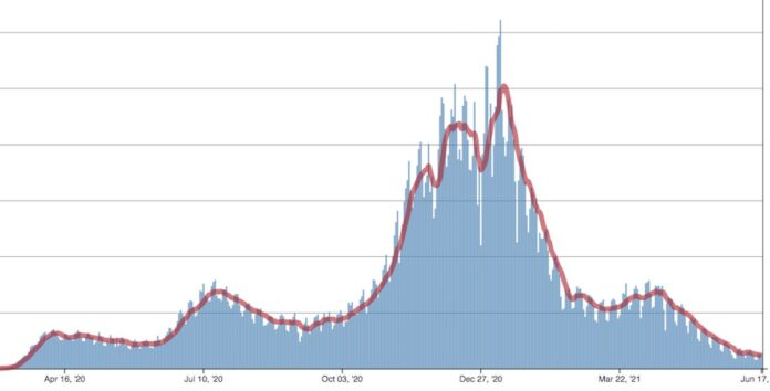 As of June 17, the 7-day moving average of reported cases was down this year by 94% from the peak in January—tumbling from more than a quarter million new cases per day to now just 14,000 cases (down 6% from the previous week).