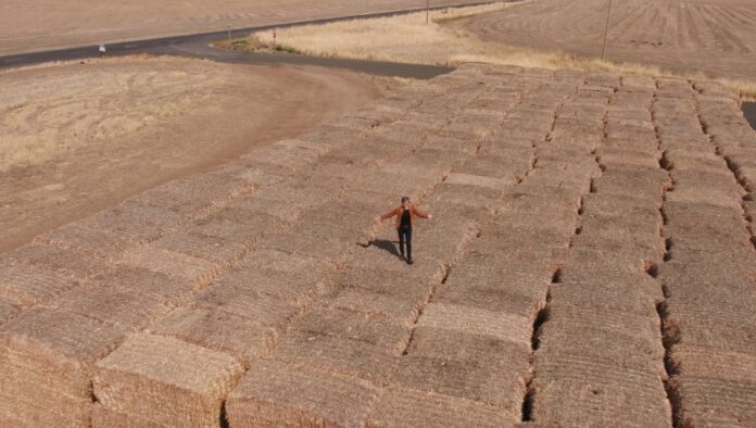 Canopy's Executive Director Nicole Rycroft standing on a huge stack of waste wheat straw/Canopy