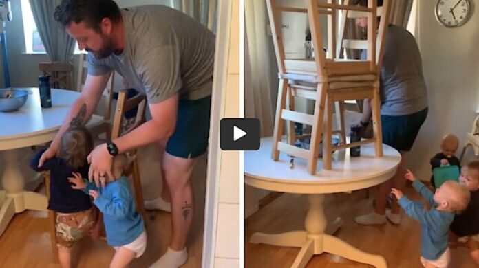 Just like the mama bear that needed to get all four cubs across the road, we couldn’t help but smile—and relate to—this dad who is doing his best to keep two of the triplet babies from climbing onto the kitchen table from multiple chairs.