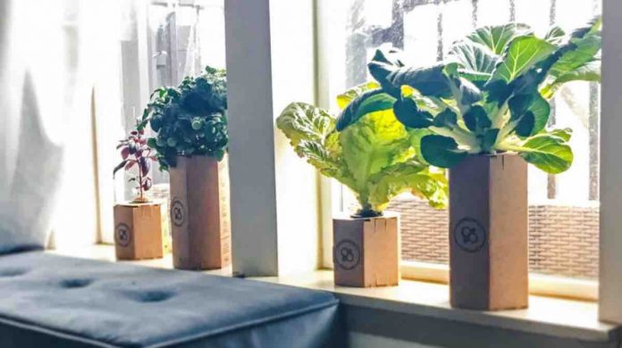 The pods are built using cardboard liners, a coconut coir disc in which seeds are planted, reusable netted cups to hold the plant, and a nutrient solution that nourishes the greenery.