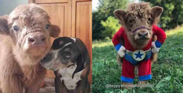 “We knew he would soon outgrow his doggy friends and needed a buddy (they are herd animals and are unhappy without a companion) so we found him some orphan [cow] babies as companions. Since they are also orphans, they accepted James (even though he sometimes wears funny costumes). They bonded right away.”