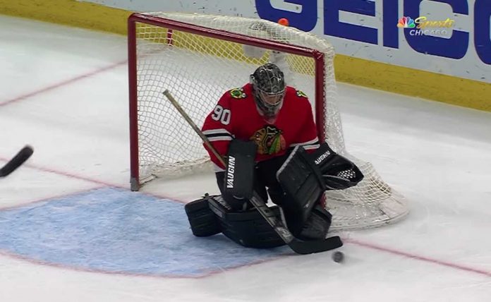 The Blackhawks starter goalie Anton Forsberg hurt himself during pre-game warmups. Collin Delia, who is the backup goalie for Forsberg, then sustained a body injury during the third quarter.