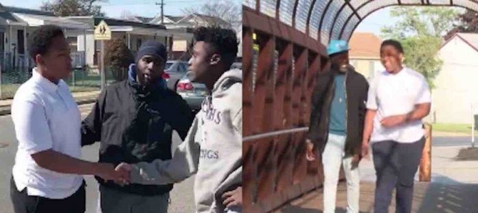 Suddenly, Ibn Ali Miller marches up to the group, steps into the middle of the fight, and demands that the youths stop exchanging blows.