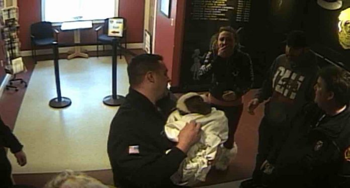 The woman, Megan Vitale, said that her 9-week-old Saint Bernard puppy named Bodhi had gotten a piece of food lodged in its throat. When her acquaintance brought the dog into the station, it was limp and unresponsive.