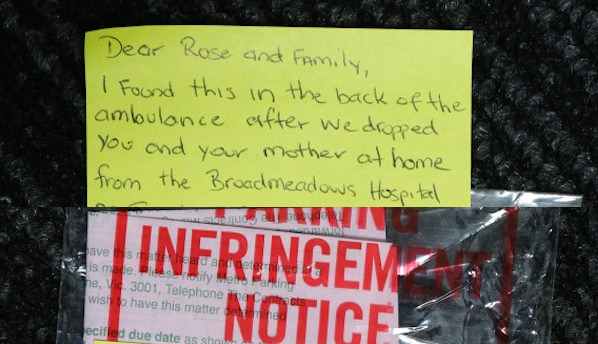 Dear Rose and Family, I found this in the back of the ambulance after we dropped you and your mother at home from the Broadmeadows Hospital on Tuesday afternoon. I didn’t want you to incur a late fee from this parking fine so I’m posting this back to you. I also decided to pay this fine for you given the difficult time you and your family are going through.