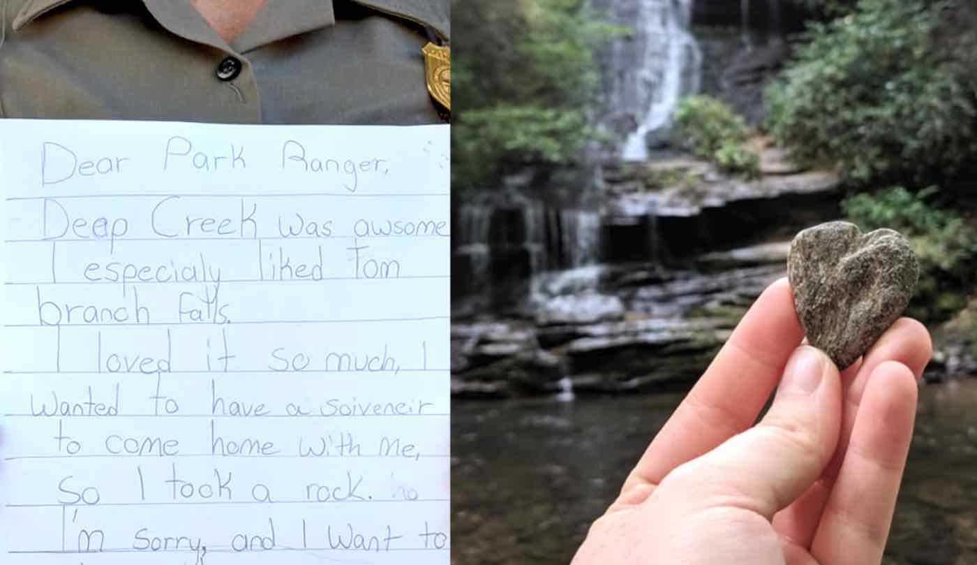 The package included a small heart-shaped rock and an apology letter from the girl explaining how she’d felt guilty about taking the rock during her recent visit to the park.