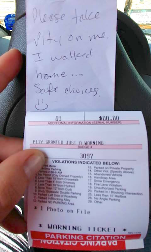The note read: “Please take pity on me. I walked home… safe choices.” The words were followed by a little smiley face.
