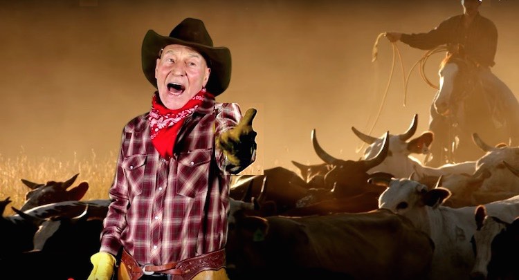 Patrick Stewart trades in his Star Fleet uniform for a ten-gallon hat in his latest role: “Cowboy Pat” — a parody video of a country-western singer, with songs for sale that actually rustle up some cash for a good cause