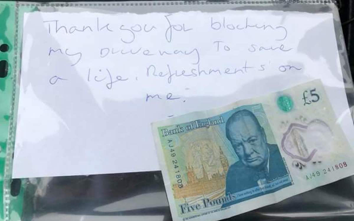 The person left a small message saying: “Thank you for blocking my driveway to save a life. Refreshments on me.” Attached to the message was a £5 note.