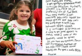 Collecting a nickel per can she wildly exceeded her goal of raising one thousand dollars and donated it all to the San Francisco food bank.