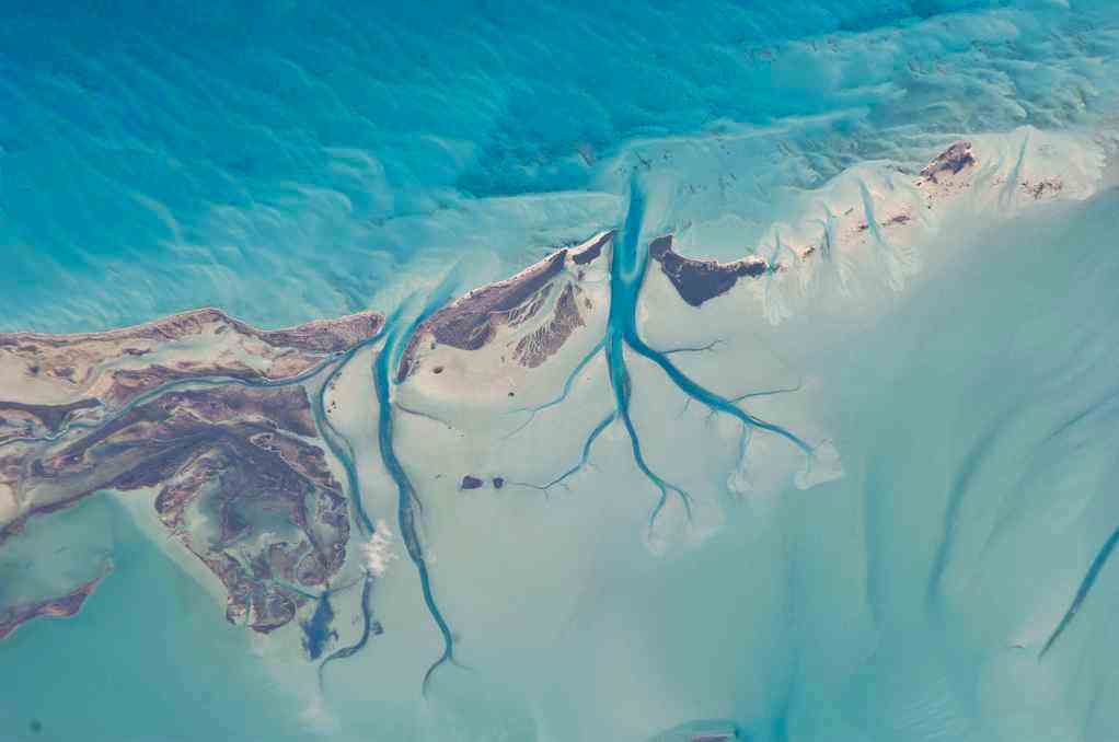 The sediments are formed mostly from the skeletal remains of organisms settling to the sea floor; over geologic time, these sediments will consolidate to form carbonate sedimentary rocks such as limestone. This detailed photograph provides a view of tidal flats and tidal channels near Sandy Cay on the western side of Long Island, located along the eastern margin of the Great Bahama Bank.