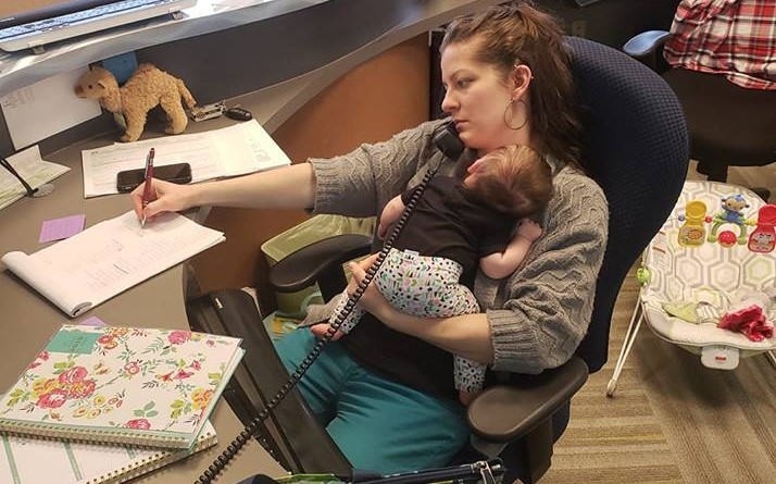 This multitasking mom has garnered a flood of appreciation and support after her boss posted a photo of her effortlessly juggling job duties with a baby girl in hand.