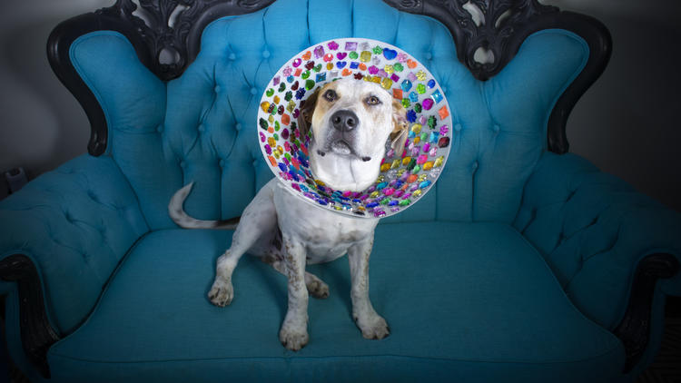 For her photography final, Erin redesigned “cones of shame” that dogs wear after they’ve undergone surgery into “cones of fame”. She figured that by transforming those sad, plastic shapes into fun and fancy crowns, it would make dogs feel less ashamed.