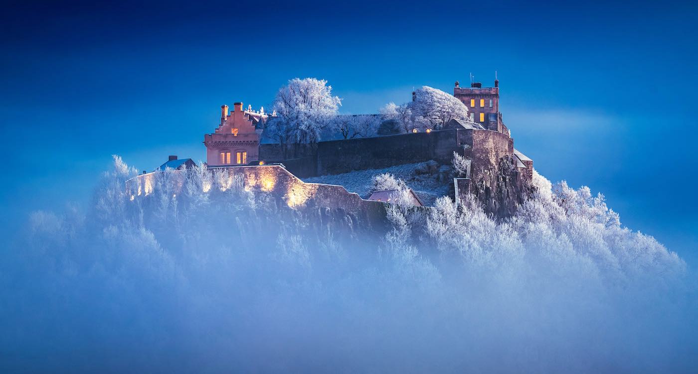 A photographer captured a magical moment when he looked up and snapped the snow-capped Stirling Castle shrouded in mist at sunset.