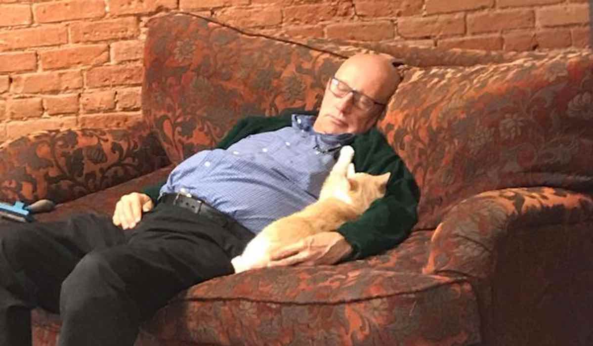 Earlier this week, Safe Haven published photos of Lauerman napping alongside some of their feline residents, praising him for his labor of love.