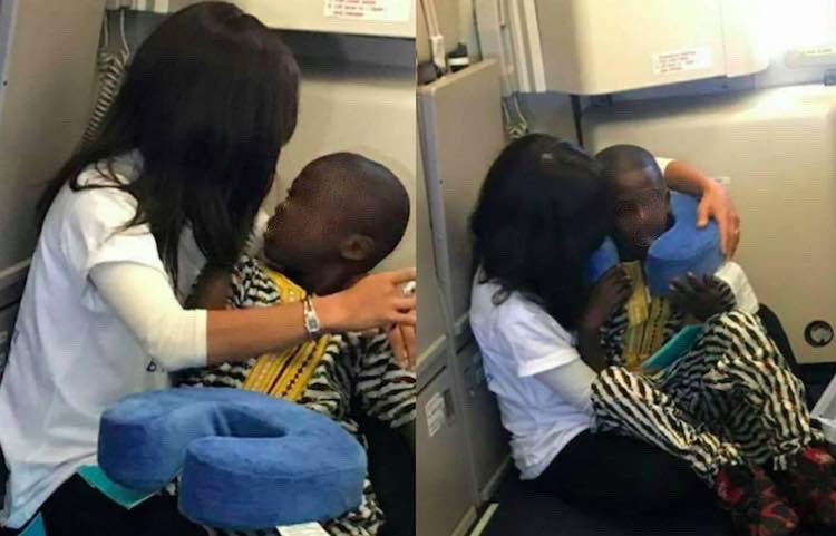 She walked up to the boy and offered him her hand. When he took it, she led him to the back of the plane, took his shoes off so he could be more comfortable, and proceeded to quietly sit and play for several hours.