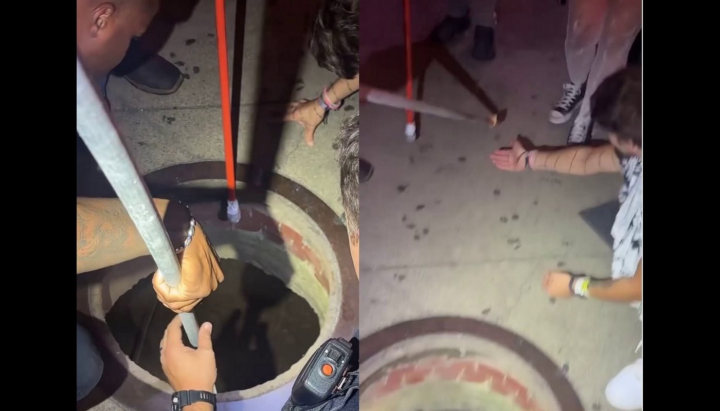 A video, released by the police, shows one of the officers slowly pulling the metal pole and the ring attached to it out of the drain.