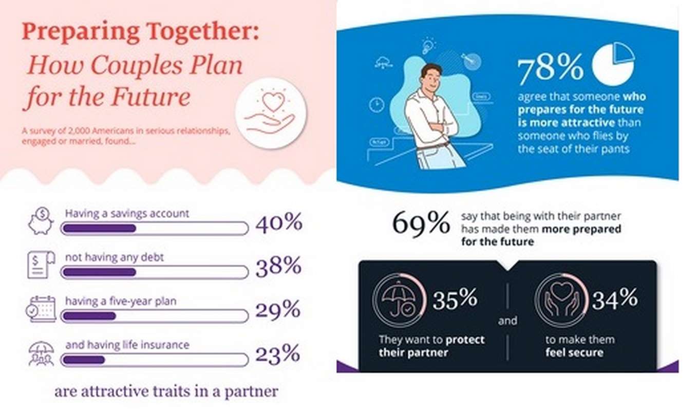 According to a OnePoll survey of 2,000 U.S. adults in serious relationships, engaged or married, having a savings account (40%), not having any debt (38%), and having a five-year plan (29%) are all attractive traits in a partner.
