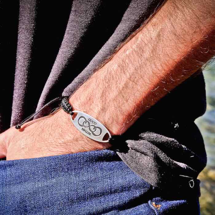Over many months, the logo evolved into an infinity symbol represented by the double “o” in Good and interlocking with the G and D. Within Good is printed on the top of the bracelet and on the back is printed, There is God. The rope symbolizes strength, and a strong connection between Good and God (always inside us).