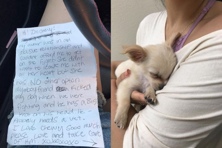 “Hi! I’m Chewy! My owner was in an abusive relationship and couldn’t afford me to get on the flight. She didn’t want to leave me with all her heart, but she has no other option. My ex-boyfriend kicked my dog when we were fighting and he has a big knot on his head. He probably needs a vet. I love Chewy sooo much – please love and take care of him.”