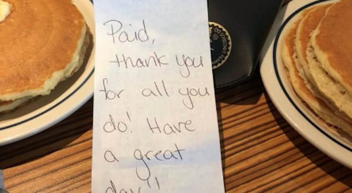 Instead, they got a receipt from the woman who had already paid for their collective $77 meal, saying: “Thank you for all you do! Have a great day! –Recovering Addict”