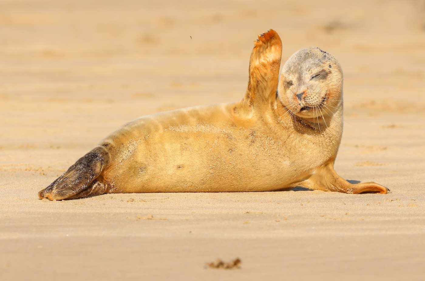An adorable photo will forever mark the moment a seal pup appeared to give a big wave to the camera as it lounged on an English beach.