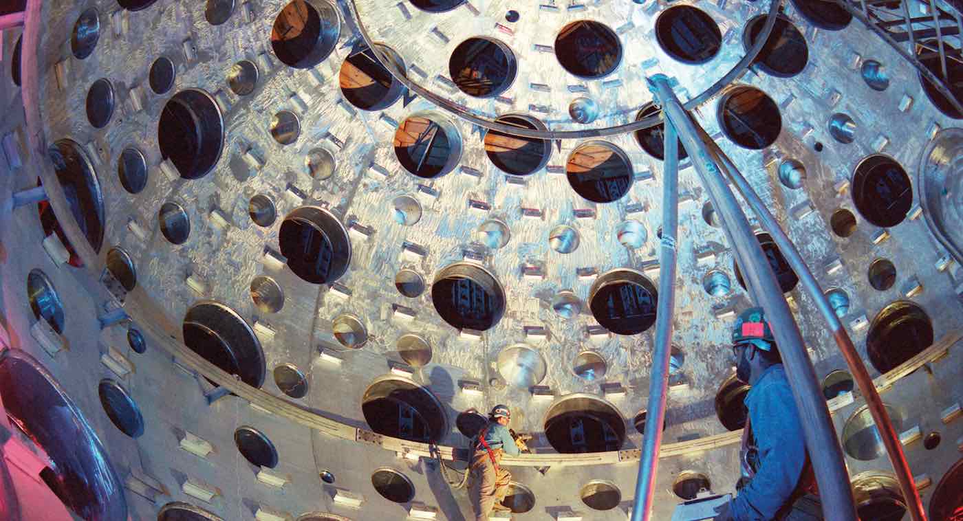The laser inertial confinement fusion experiments took place at the National Ignition Facility at Lawrence Livermore National Laboratory in California. Within a specially constructed cavity, a carbon-formed capsule, about one millimeter in diameter, contains both cryogenically frozen deuterium-tritium and the same as gas mixture — the fuel. When the cavity is heated with lasers, an x-ray bath results and warms the capsule until the fuel inside is compressed.