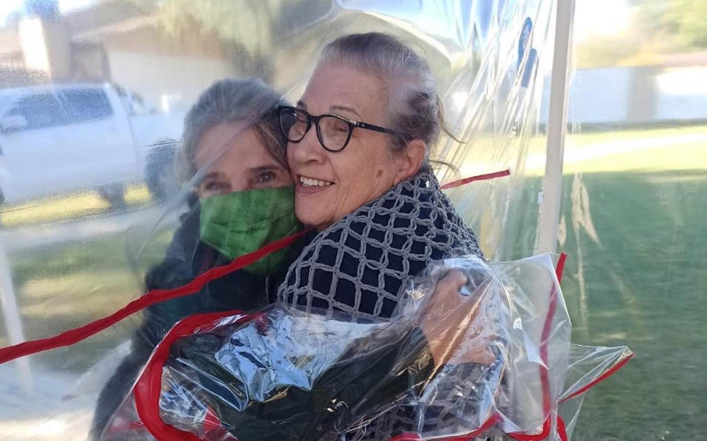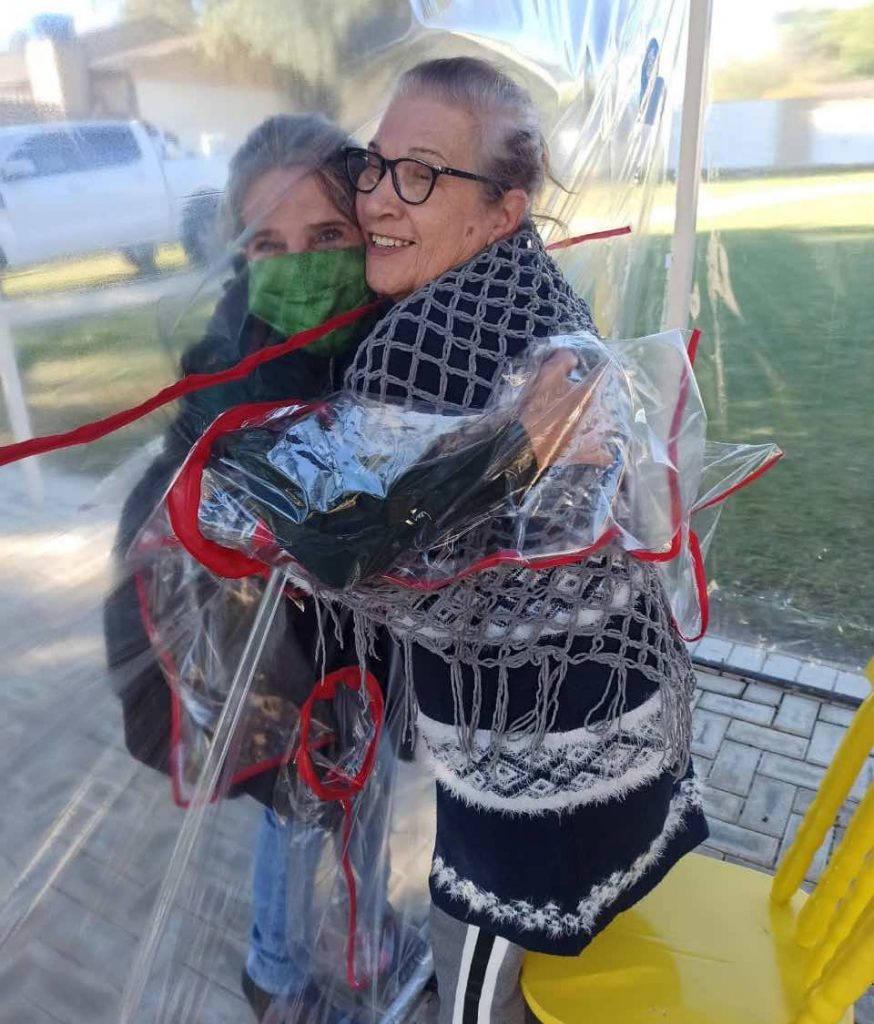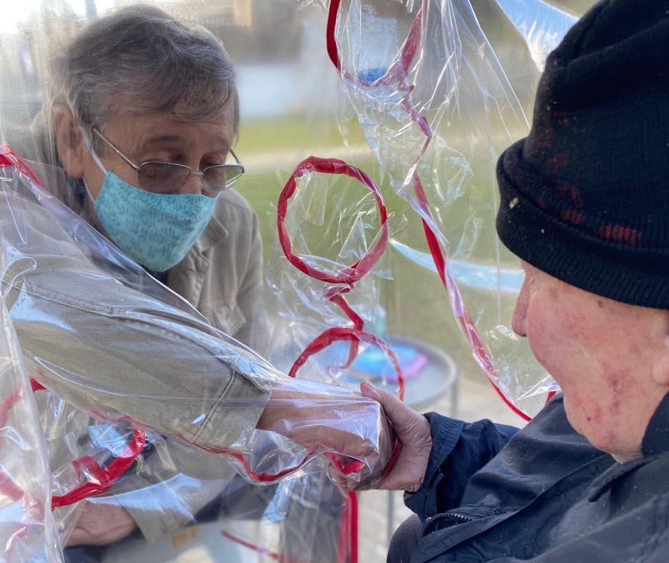 Made of thick plastic sheeting, the hug tunnel has arm holes for visitors and residents to wrap their arms around the person standing on the other side.
