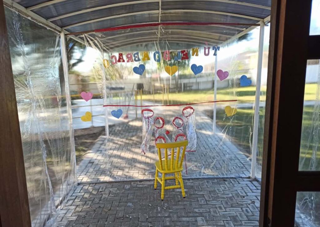 To keep it extra safe for the residents, the staff at Três Figueiras makes sure the plastic is disinfected in between visits, which are all scheduled in advance. And visitors also have their temperatures checked and are asked to use hand sanitizer beforehand.