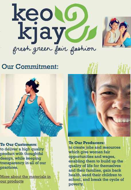 These days, being called a “socially responsible” enterprise is a badge of honor. But let’s face it, there are socially responsible enterprises, and then there are socially responsible enterprises! KeoK’jay, which means “bright green”, carefully considers every aspect of the business with the customer, the producer, and the environment in mind, from design, to materials, to production and packaging. According to Rachel: “In order for responsible production to take root, it needs to be shown to be profitable without aid subsidies.” KeoK’jay is (in some ways) a traditional, sales-supported business that can compete in the international fashion scene, but without all the labor violations and environment trashing.