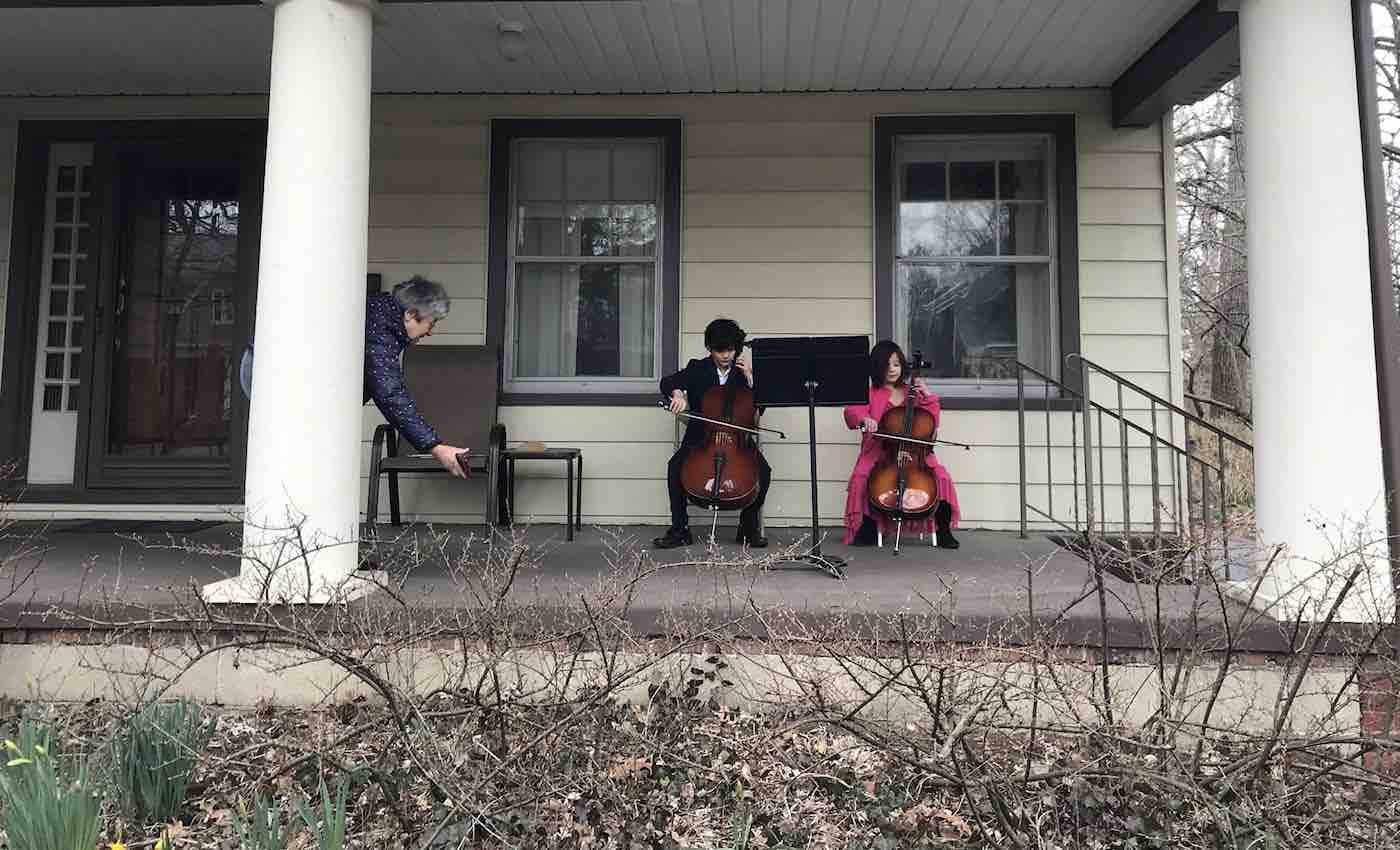 Taran and Calliope donned their nicest concert clothes before carrying their cellos over to Schlam’s porch. For 30 minutes, the youngsters played everything from children’s tunes to Bach suites—all while maintaining a safe distance from Schlam’s front row seat 10 feet away.