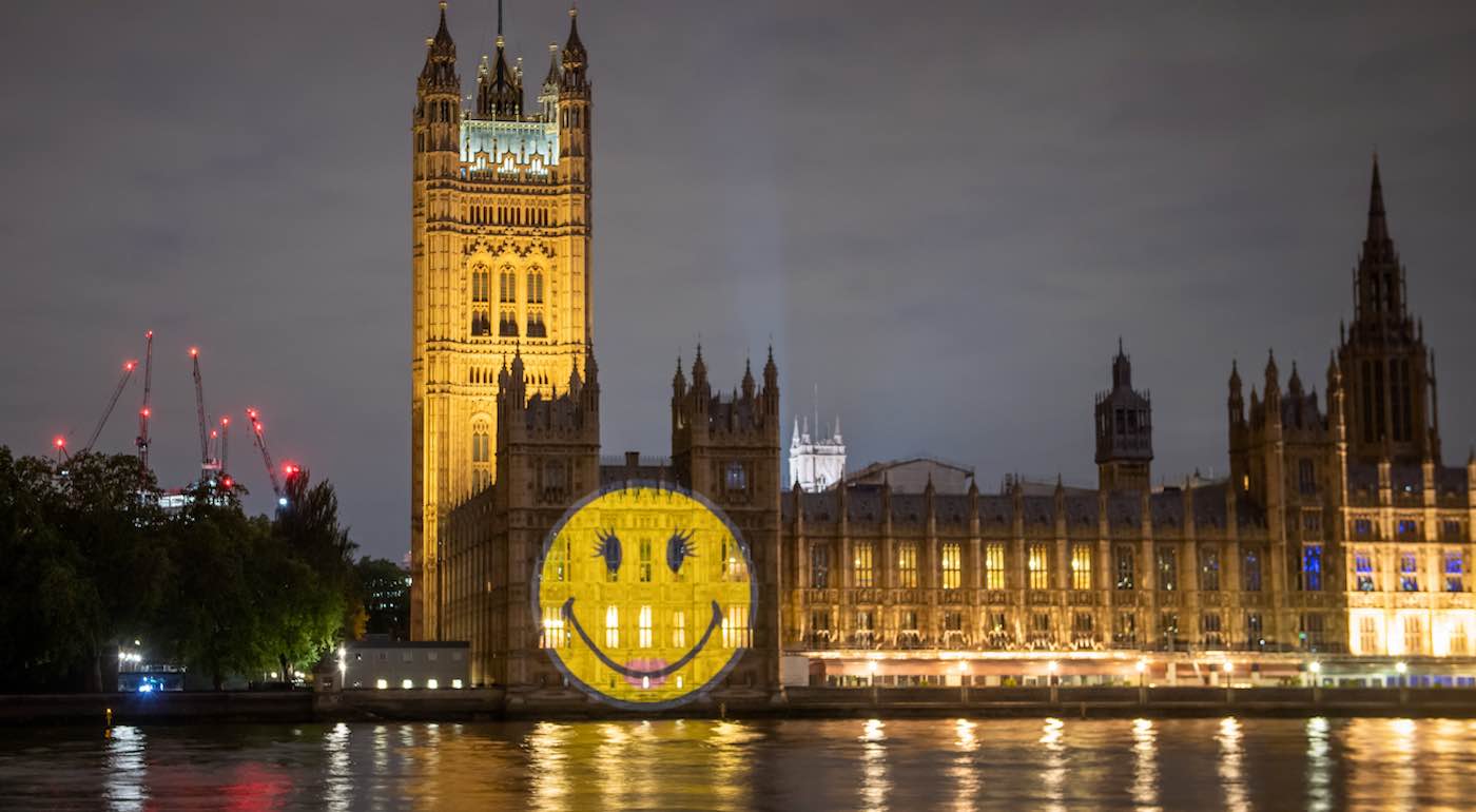 An image of a smiley face was projected onto the Houses of Parliament to spread an uplifting message of positivity during tough times.