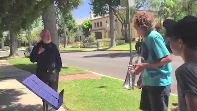 That’s why 13-year-old musicians Bryce Hayashi and Michael “Mickle” Miller paid homage to the franchise’s composer, John Williams, by performing the theme song on his front lawn last Monday.