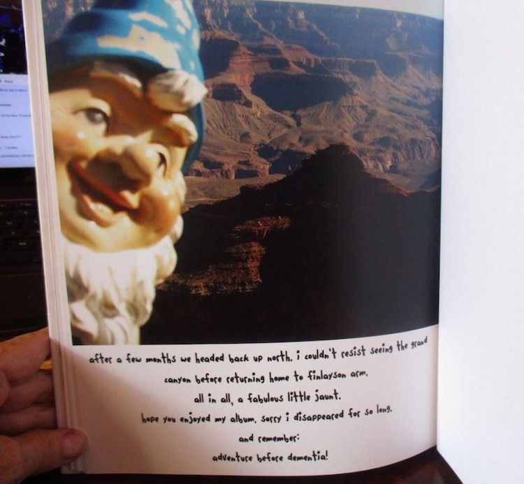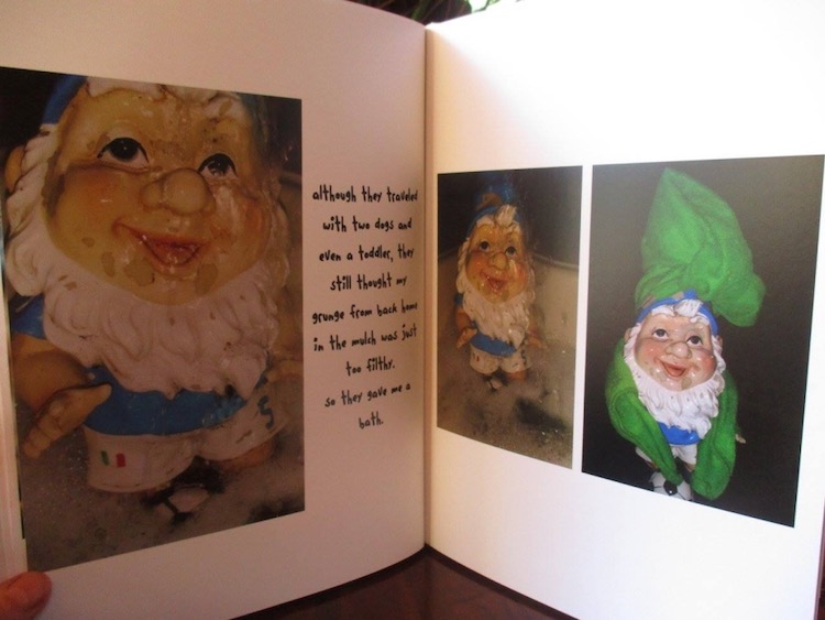 “Hi, my name is Leopold the traveling gnome,” read the first page of the book. “One morning back on December ’15, I saw a motorhome toddle along Finlayson Arm Road and I thought to myself, ‘There’s got to be more to life than standing knee-deep in rainwater, being peed on by neighborhood dogs and staring at the same view every single day.”