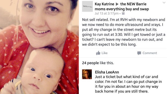 Over the next several hours, five different women in her hometown of Barrie, Ontario, went to Goeman’s car to feed her meter – while another 100 people wrote in with encouraging words or other offers to help the family.