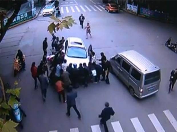 Video from China shows the goodness of strangers as 20 people rush to the aid of a woman run over by a car following a motorbike crash.