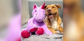 Stray Dog Kept Sneaking Into Dollar Store For a Stuffed Unicorn – Now He and the Toy Have a New Forever Home