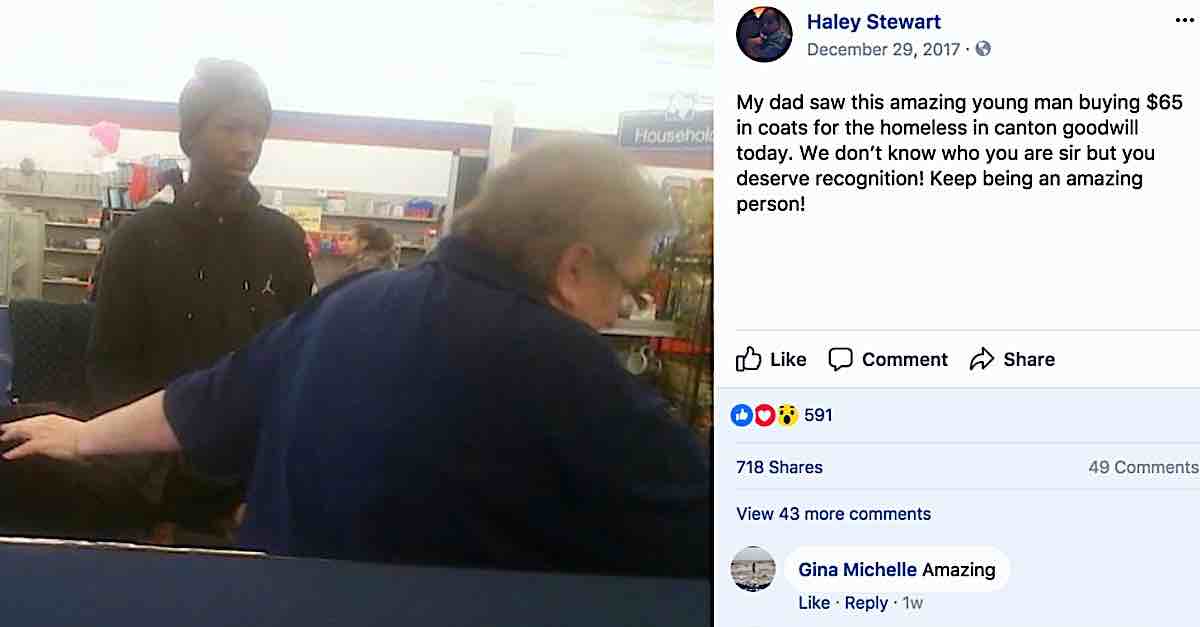 The stranger, Jim Glasgow, was surprised by how many coats were in the teen’s hands. White then told him that he was buying the coats for homeless members of his community.