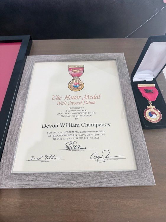 When all was said and done, Devon, having been recommended by his Scout Leader, was awarded the Honor Medal with Crossed Palms for unusual heroism demonstrated in the course of saving a life. Fewer than 300 of these medals have been awarded in the more than 100-year history of the Boy Scouts of America.