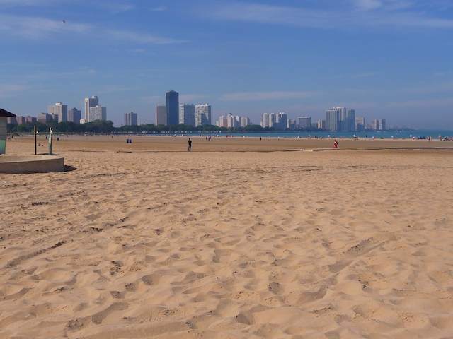 After lunch, I wanted to sink my bare feet into the warm sand of Montrose Beach. Inspired by our little redhead and me jumping around waving our arms, Heyward took off his shirt and ran into Lake Michigan for a swim. That inspired me to wade in the cool sandy shallows.